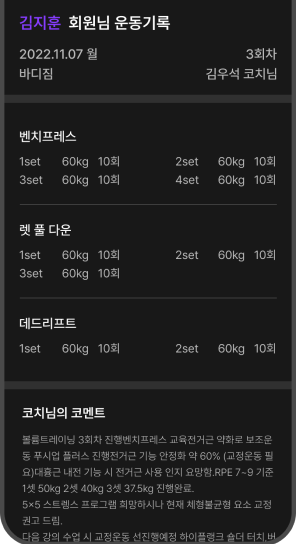 걱정하지 마세요. 피벗에서는 운동 차트 시스템을 통해 매 회차마다 운동 기록, 사진, 영상과 전문가의 피드백을 제공하고 있습니다.운동 차트는 언제든지 원할 때 다시 확인할 수 있고, 전문가가 바뀌더라도 운동 차트를 공유하여 연속성 있는 PT를 받을 수 있습니다.